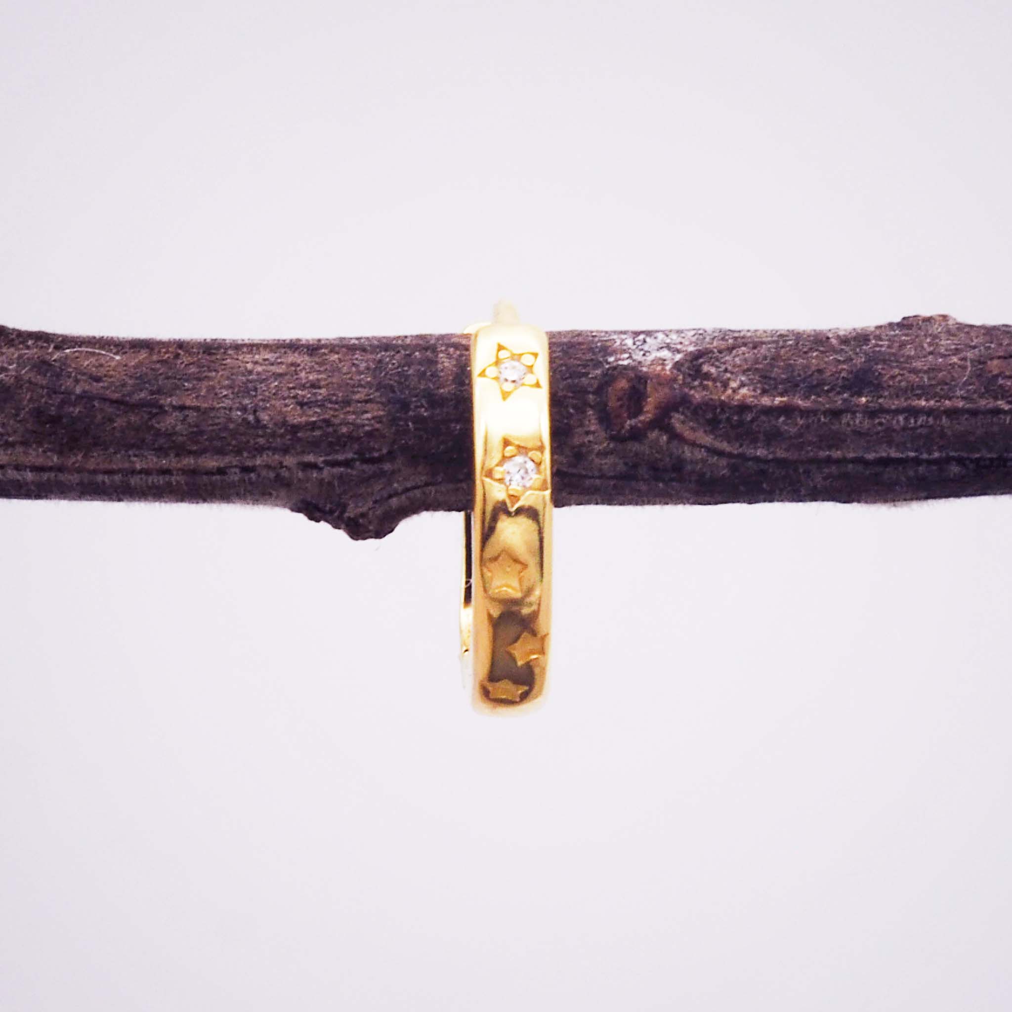 Crafted with gold plating over sterling silver and adorned with cubic zirconia, each piece captures a minimalist yet dreamy vibe — one hoop features engraved stars, another showcases shimmering sunbursts, and the stud glistens with a cluster of stones.