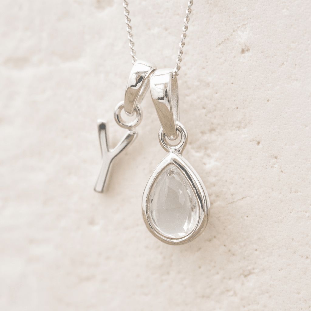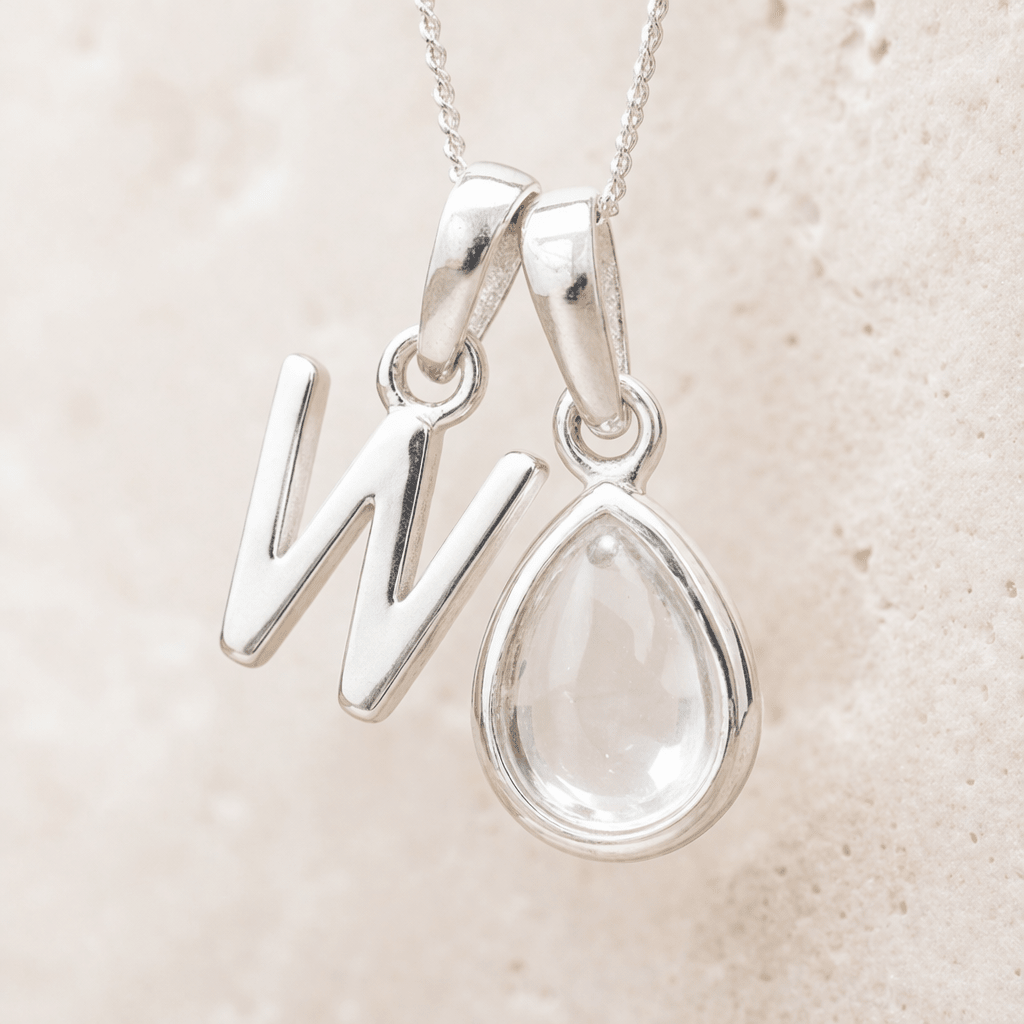The Sterling Silver Initial and April Birthstone Herkimer Quartz Necklace pairs a polished initial charm with a natural Herkimer Quartz gemstone, creating a refined piece of personalised jewellery. Crafted from 925 Sterling Silver, this initial birthstone necklace brings together personal meaning and the clear, understated beauty of the April birthstone in a clean, balanced design.