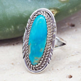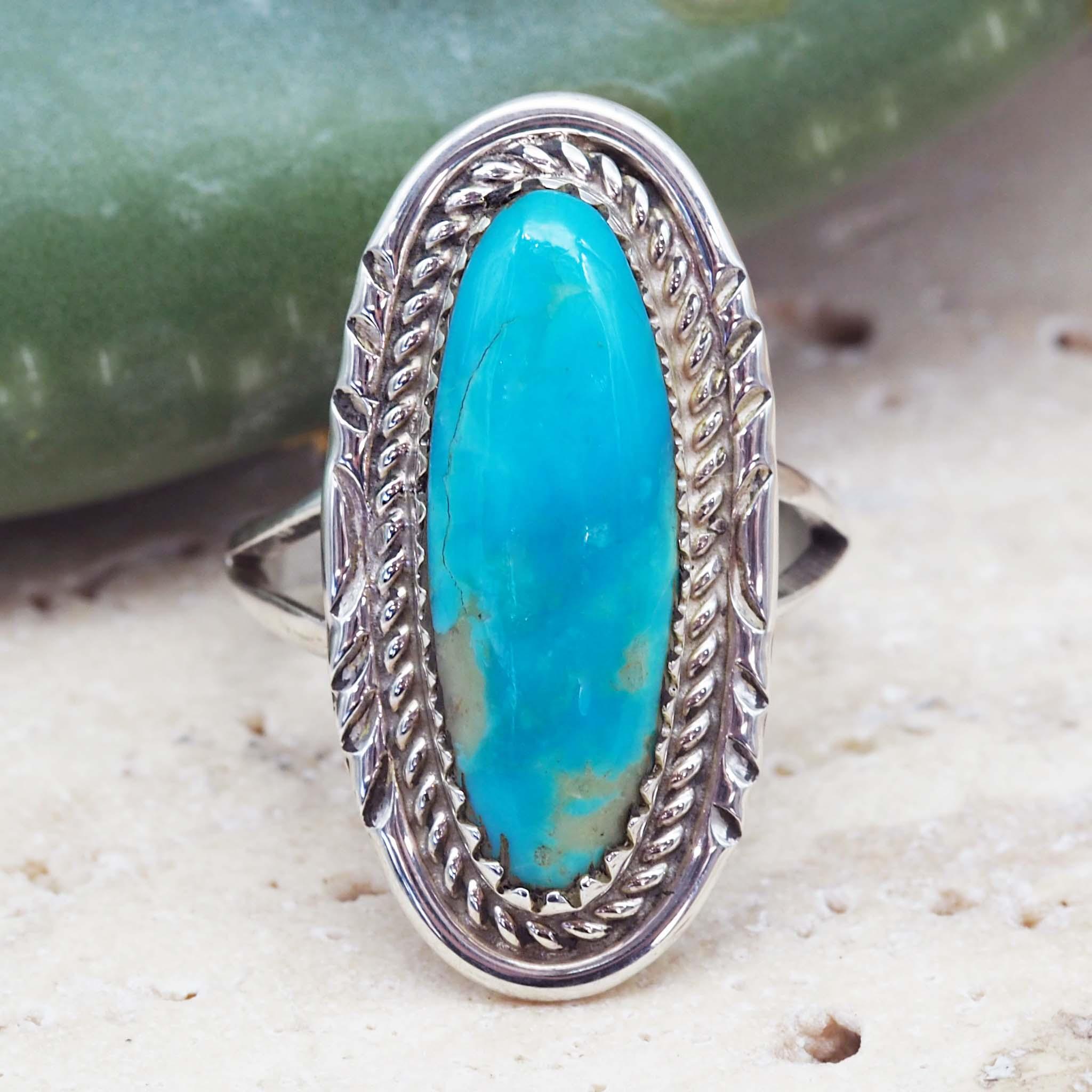 Bold and captivating, this turquoise ring is a true statement piece for lovers of boho style and artisan craftsmanship. Its detailed Navajo silver work combined with the vivid oval Turquoise stone makes it a standout accessory, perfect for expressing individuality and a connection to meaningful traditions.