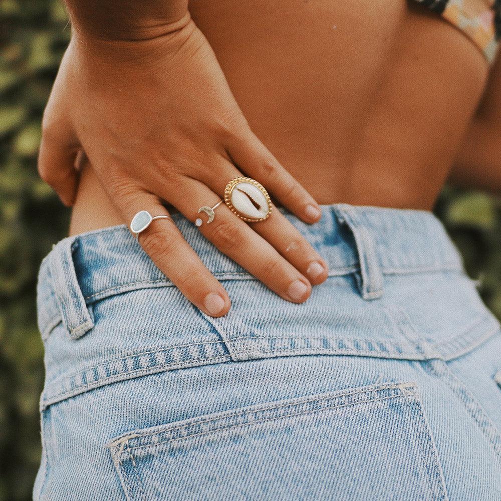Gold Cowrie Shell Ring being worn - womens cowrie shell jewellery by australian jewellery brands online indie and harper