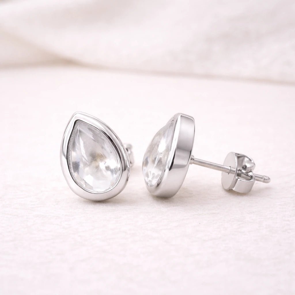The April Birthstone Herkimer Quartz Stud Earrings feature natural Herkimer Quartz gemstones in a smooth teardrop cabochon cut, carefully bezel set for a refined and timeless finish. The silhouette is clean and minimal, designed for effortless everyday wear.
