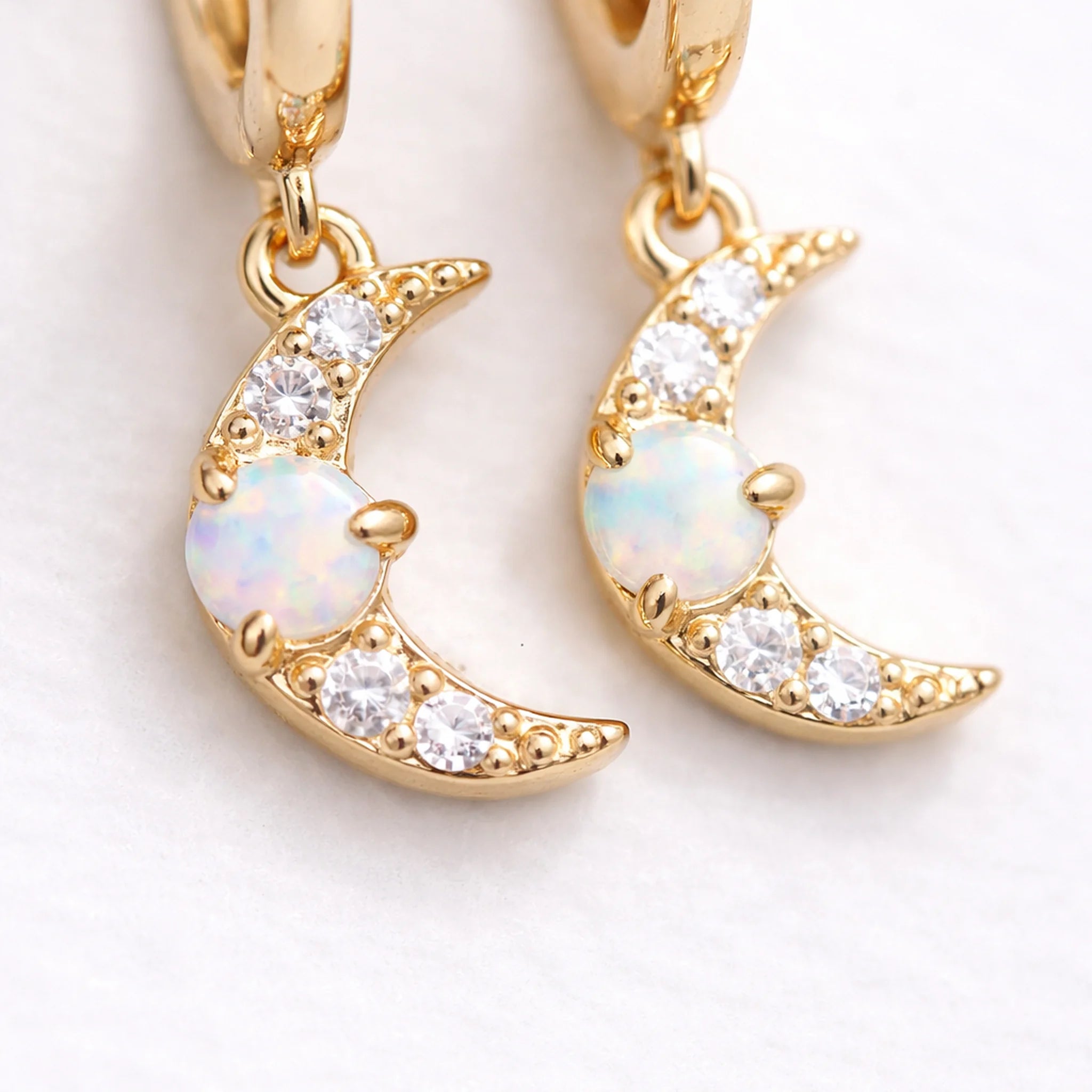 The Dainty Luna Opal Earrings feature small gold hoops adorned with crescent moon charms, centred with luminous opal stones and accented by sparkling cubic zirconia. Crafted in 18k gold plated 925 sterling silver, these earrings bring a subtle celestial touch to everyday wear.