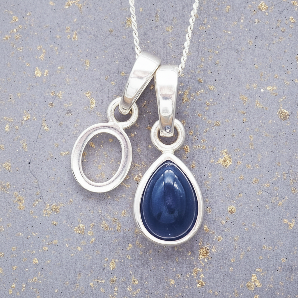 The natural sapphire is cut in a smooth tear drop cabochon and bezel set, giving the gemstone a polished finish that complements the simplicity of the initial charm. Its rich blue tone adds depth and contrast while maintaining a minimal everyday silhouette.