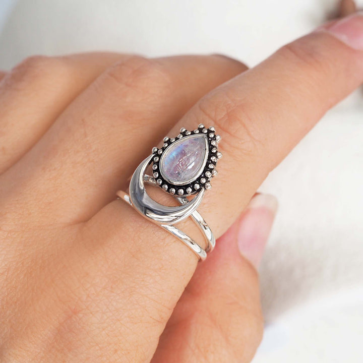 A: The ring showcases a teardrop-shaped natural Moonstone known for its soft glow.