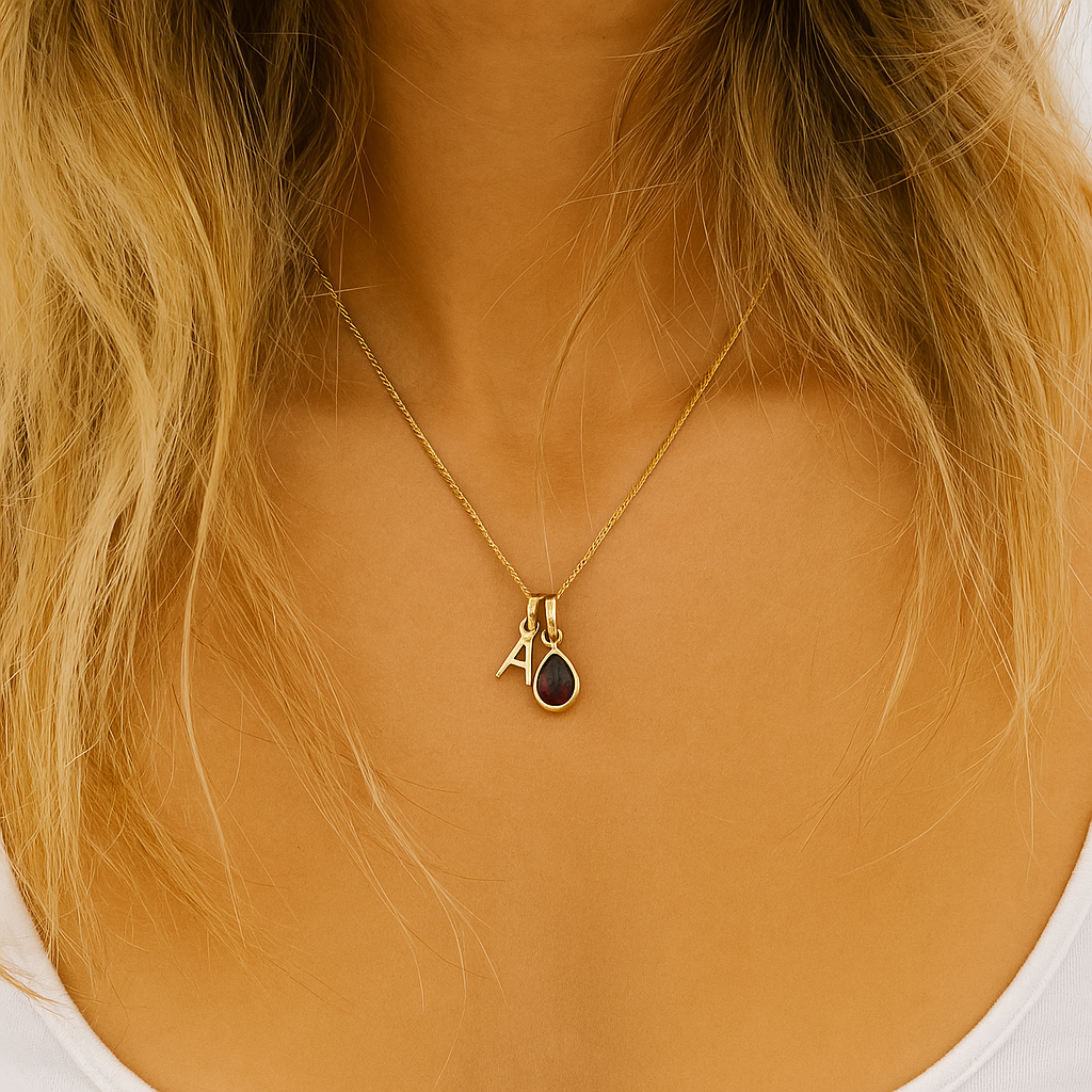 Discover a personalised gold initial pendant combined with a rich Garnet drop, representing the perfect modern January birthstone keepsake.