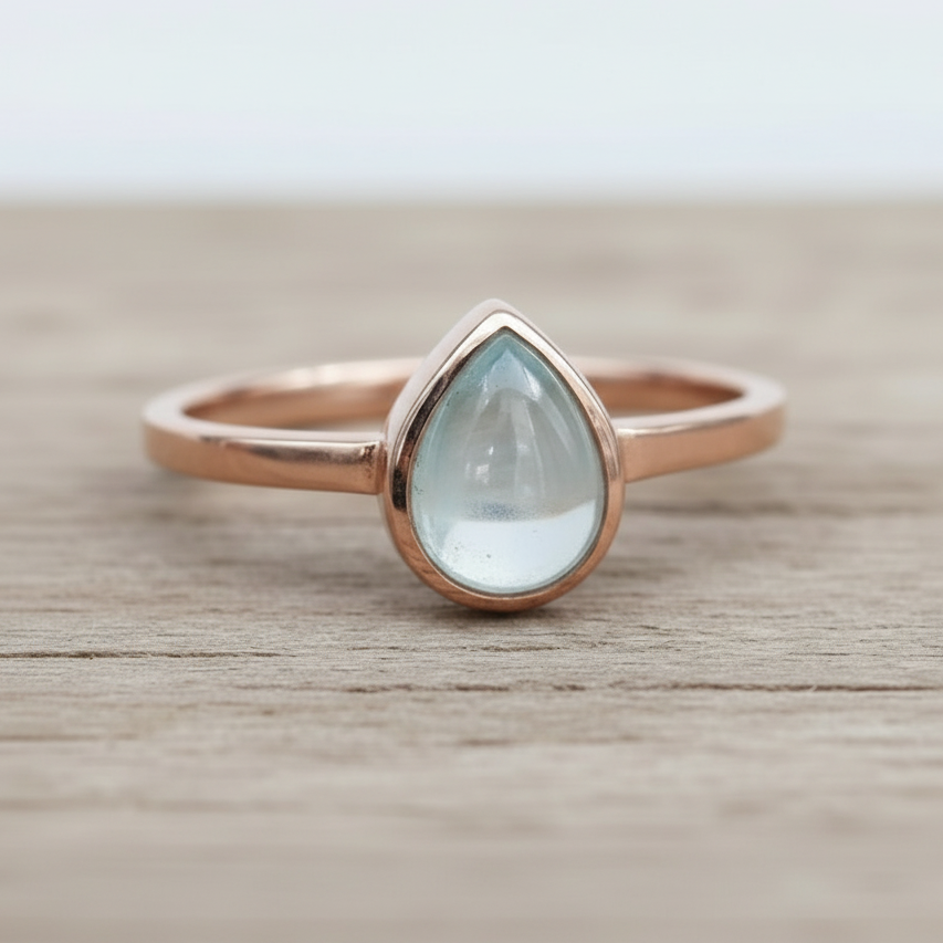 The March Birthstone Aquamarine Ring features a natural Aquamarine gemstone in a smooth pear shaped cabochon, securely bezel set into a polished 925 Sterling Silver band. Designed with balanced proportions and a low profile setting, this ring offers a refined finish that is comfortable for everyday wear.